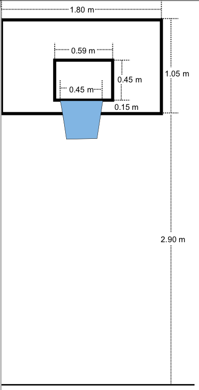 El poste y la canasta con medidas oficiales. El tablero de la canasta, es un rectángulo de 1.05 x 1.80 m, de al menos 30 mm de grosor y con los bordes inferiores acolchados.En la parte central inferior, se encuentra un rectángulo pintado de 0.59m x 0.45m y que está elevado del tablero por la parte baja 0.15m, en el interior del rectángulo se encuentra un basculante homologado que sostiene a la canasta que mide 0.45m, la canasta se agarra del rectángulo interior en su centro. El aro de la canasta debe tener un diámetro de 45,7 cm, el rectángulo interior se utiliza para calcular el tiro, y que al chocar con el la pelota se introduzca en la canasta. El aro está situado a una altura de 3,05 metros y está provisto de unas redes homologadas |